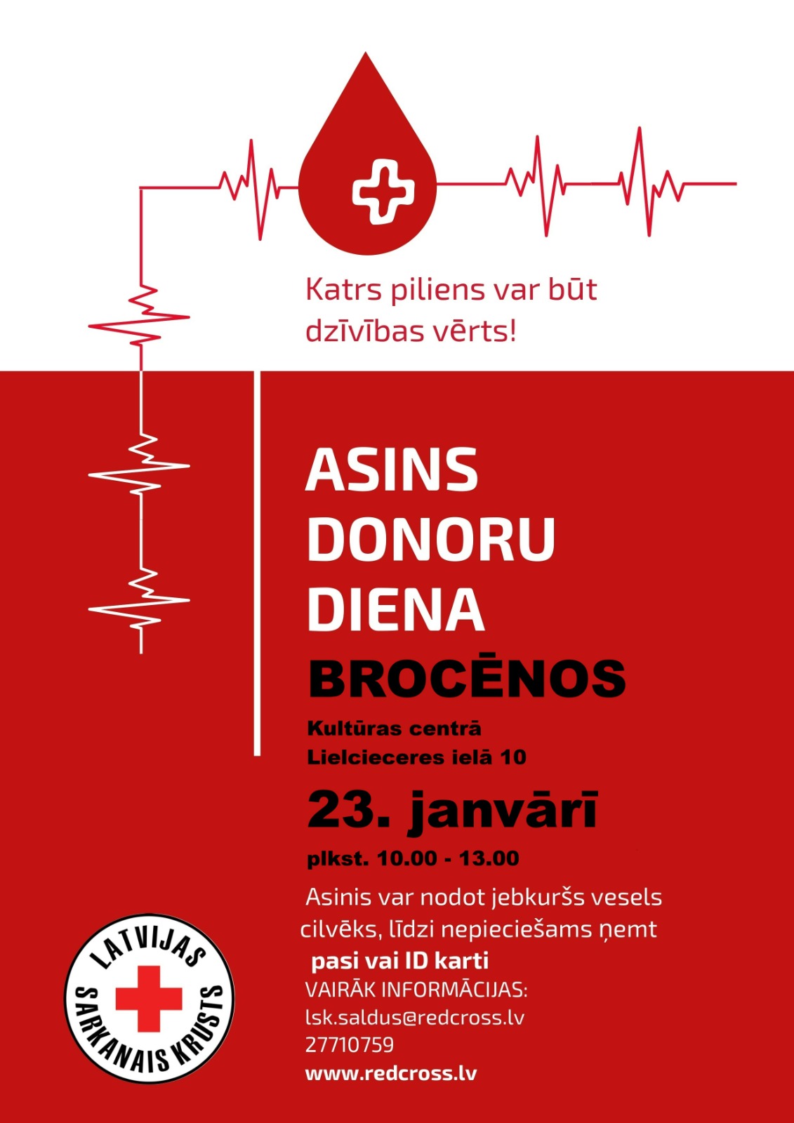 Asins donoru diena 23.janvārī Brocēnos, Lielcieceres ielā 10, Kultūras centrā no plkst.10.00-13.00.