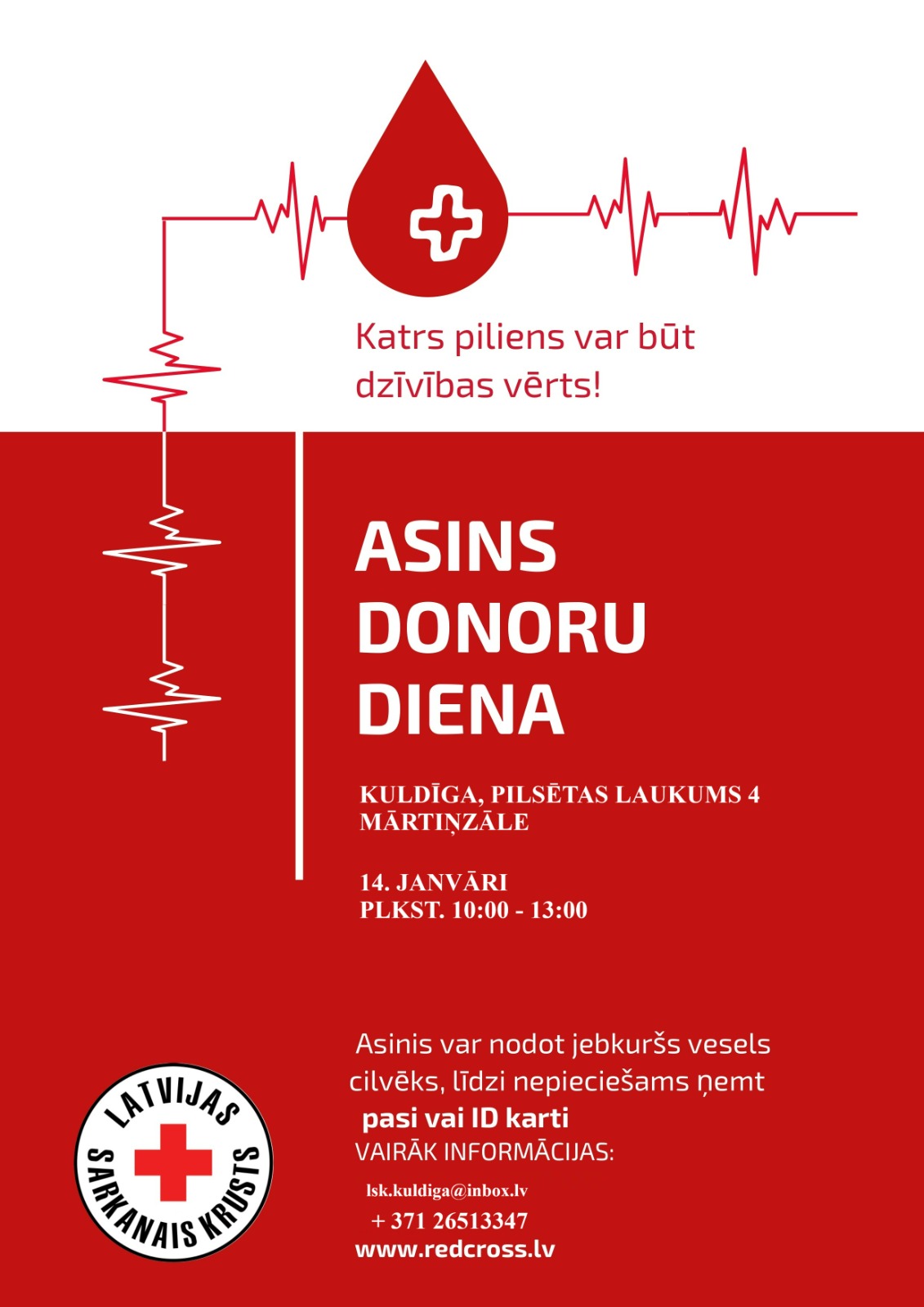 Asins donoru diena 14.janvārī Kuldīgā, Pilsētas laukumā 4, Mārtiņzālē no plkst.10.00-13.00.