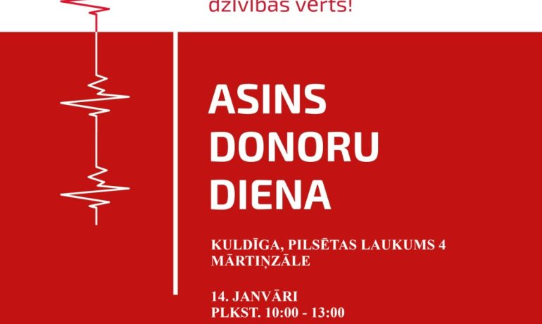 Asins donoru diena 14.janvārī Kuldīgā, Pilsētas laukumā 4, Mārtiņzālē no plkst.10.00-13.00. Par asins donoru var būt jebkurš vesels cilvēks. Līdzi nepieciešams ņemt pasi vai